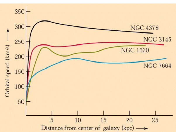 En sidste bemærkning kunne passende være, at en erkendelse af, at det meste stof i verden åbenbart ikke kan registreres direkte - det såkaldte mørke stof må forudsættes for at give forklaringer på en række observationer. Ved undersøgelser af de enkelte galaksers hastigheder i sigteretningen vha. Doppler forskydninger i galaksehobene, bliver det klart, at hobene slet ikke kan holdes sammen af gravitationskræfterne, skabt af de registrerede objekter. Lige som det var tilfældet med de målte banehastigheder af objekterne i Mælkevejens skive, fremviser rotationskurverne for fire spiralgalakser på Figur